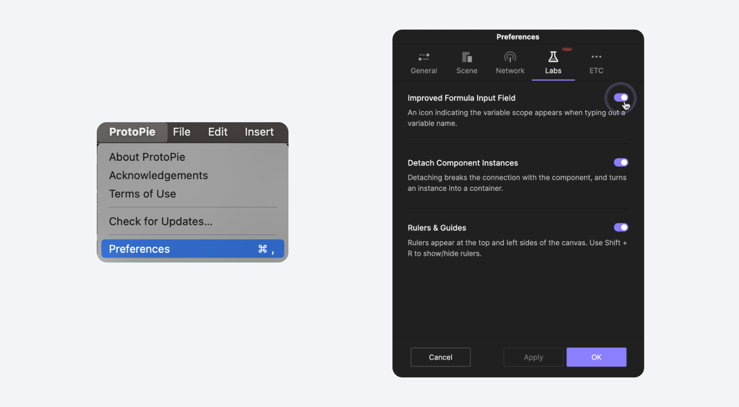We released ProtoPie 7.5 with many new features & improvements to better your prototyping experience. We wanted to involve our ProtoPie users more actively in our development process, so we introduced ProtoPie Labs (or Labs for short). This feature allows you to test our latest beta features before their official release date.